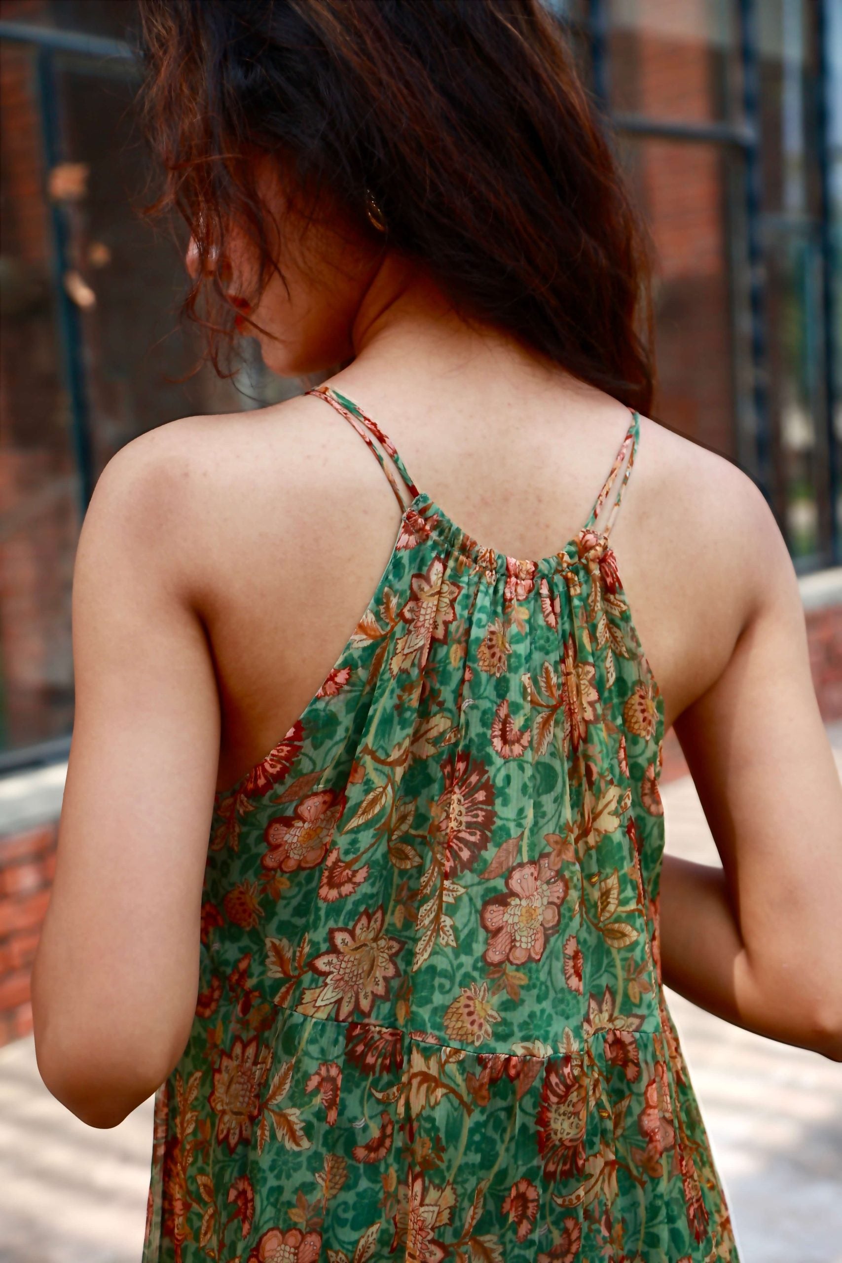This head-turning piece features a halter-style neckline that accentuates the shoulders, while the bordered tiered skirt cascades elegantly for a flattering, feminine look.Delicate details like the intricate tasseled ties lend an artisanal touch.