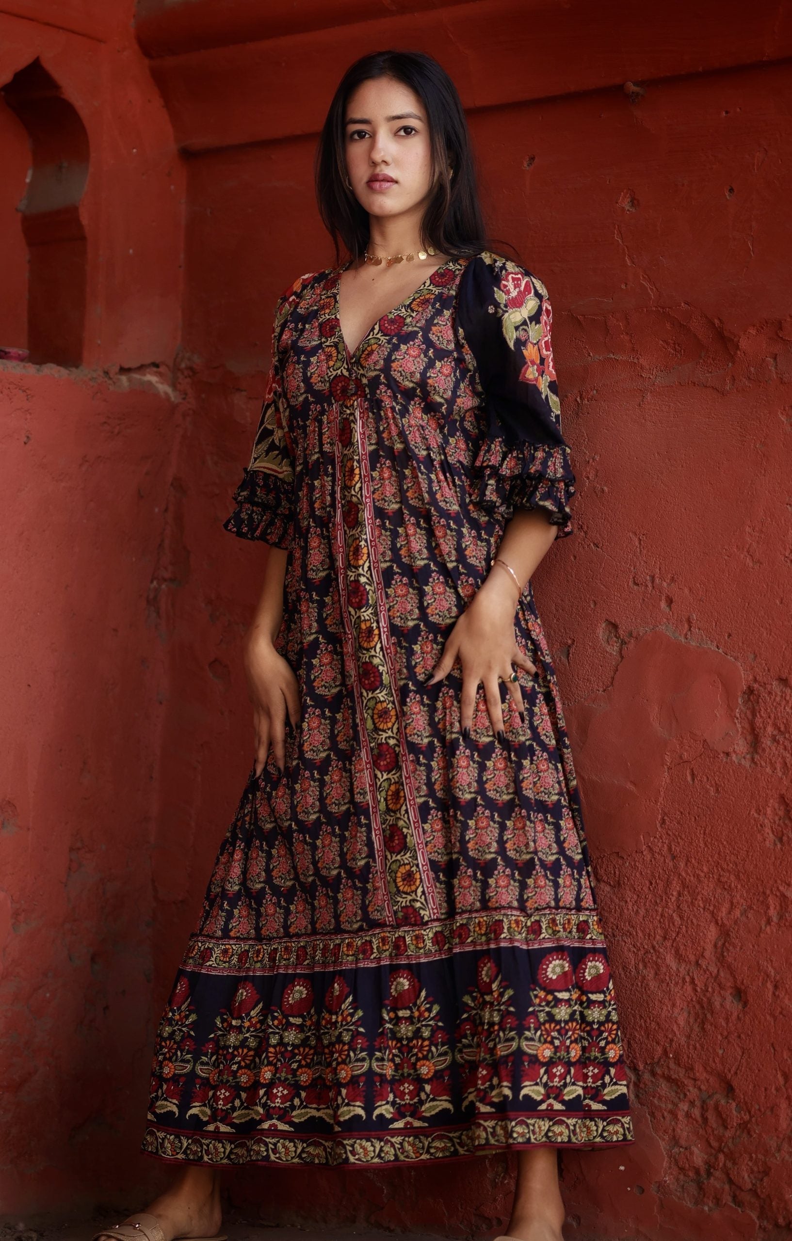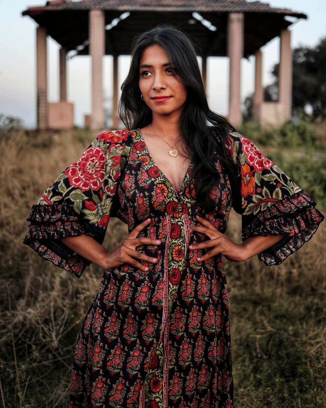 This dress with its empire silhouette, accentuates the bust and flows gracefully to the tiered hem. Designed to elongate the figure and a flattering fit for all body types with a V-neckline and the softly ruffled bell sleeves. This dress is a stunning blend of elegance and bohemian flair.