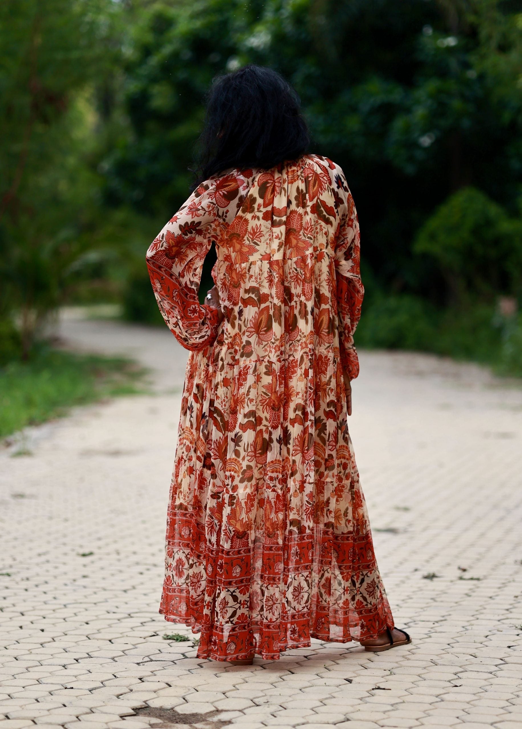 This ethereal dress features a billowing, floor-length silhouette. The voluminous bishop sleeves and delicate tassel-tie,ruffled neckline with the tiered skirt offers graceful movement.